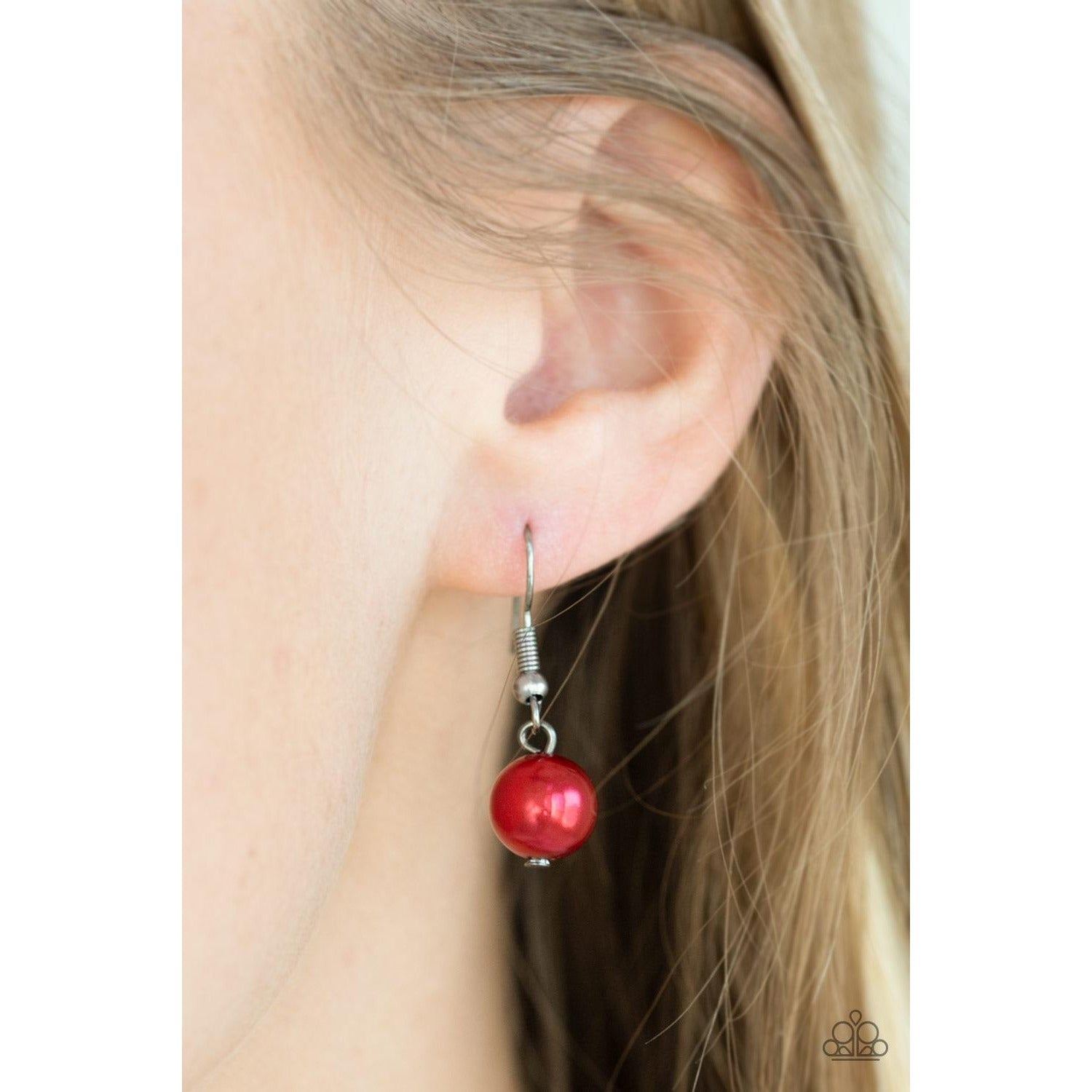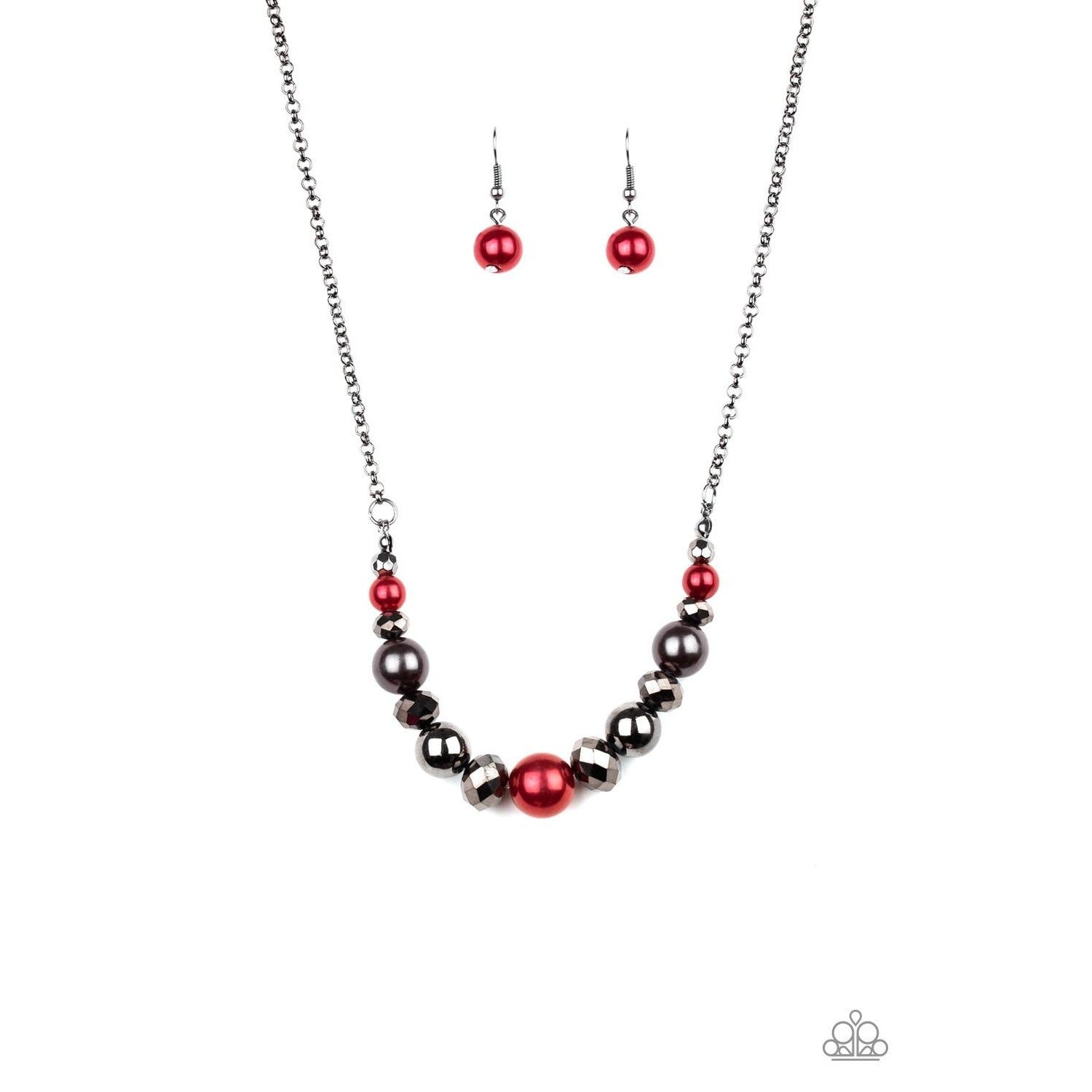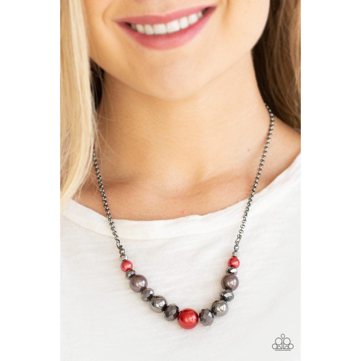 A collection of pearly red, classic gunmetal, and crystal-like hematite beads are threaded along an invisible wire below the collar for a glamorous look. Features an adjustable clasp closure.