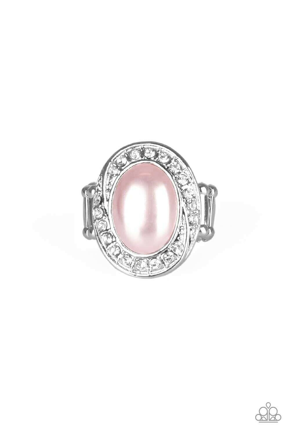 A pearly pink bead is pressed into a silver oval frame radiating with a ring of glittery white rhinestones, creating a regal statement piece atop the finger. Features a stretchy band for a flexible fit.
