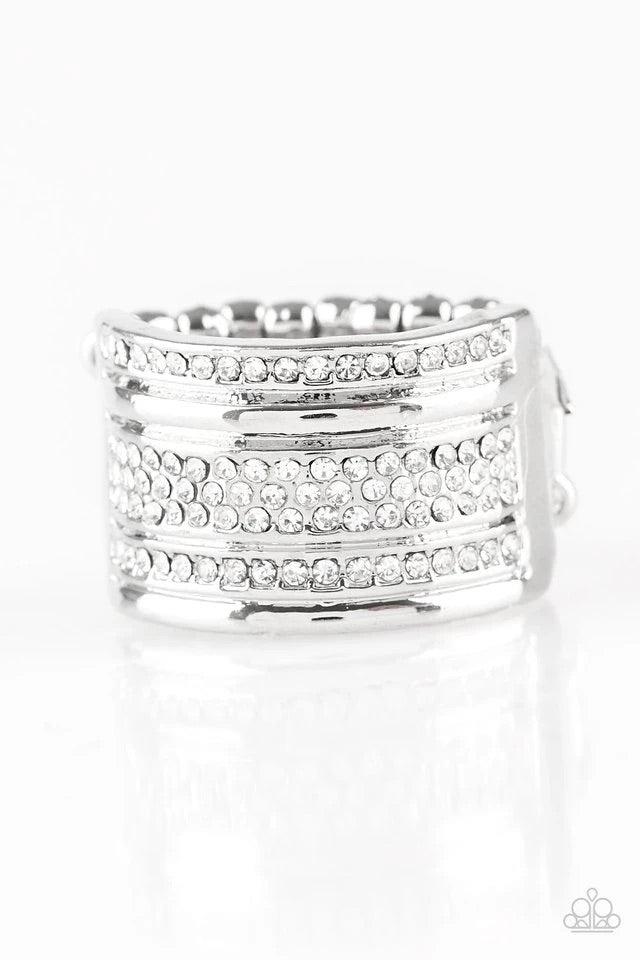 Shimmery silver and white rhinestone encrusted bands stack across the finger for a glamorous look. Features a stretchy band for a flexible fit.