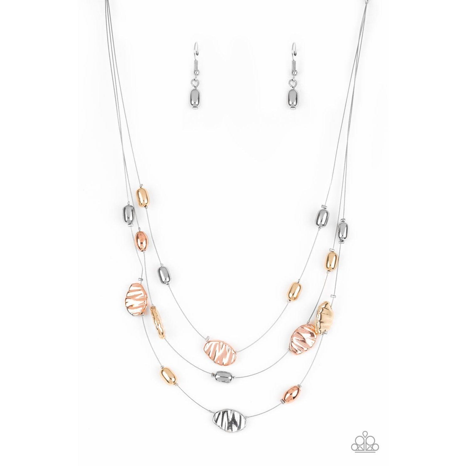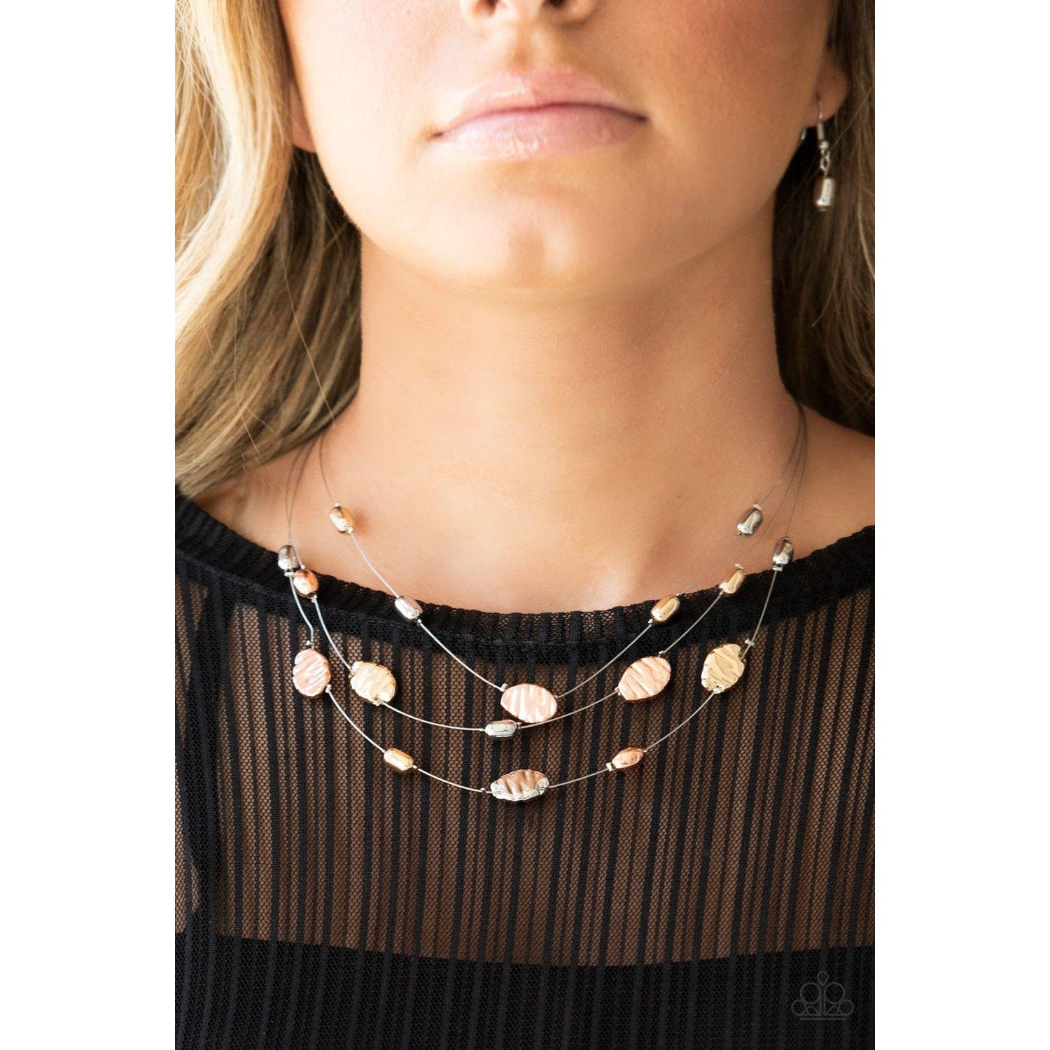 Featuring smooth and delicately hammered finishes, mismatched shiny copper, gold, and silver beads are threaded along dainty silver wire, creating floating layers below the collar. Features an adjustable clasp closure.