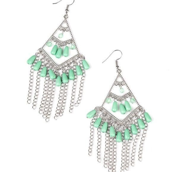 Dainty green teardrop beads cascade from three tiers of a silver kite-shaped frame. Shimmery silver chains stream from the bottom of the frame, adding movement to the colorful fringe. Earring attaches to a standard fishhook fitting.
