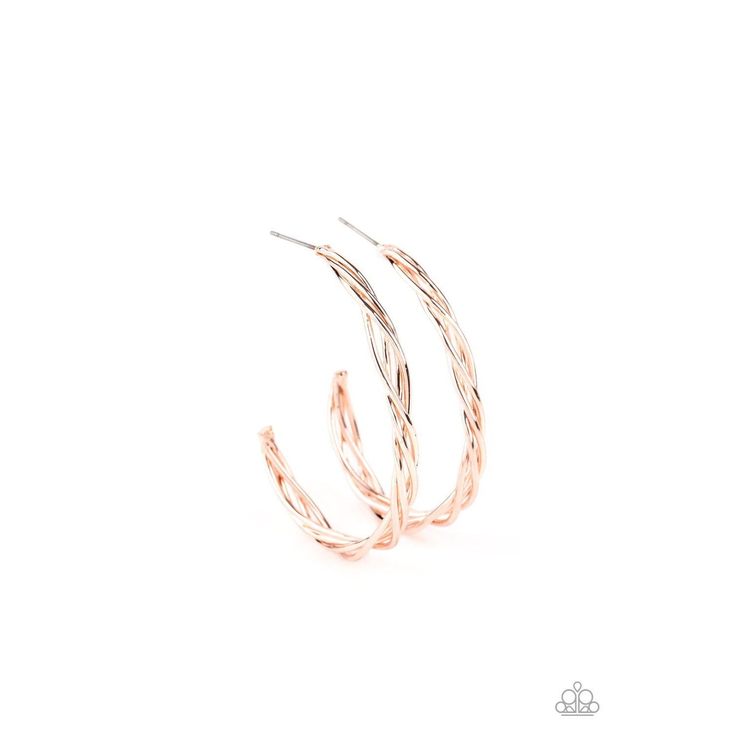 Glistening rose gold bars delicately twist into a hook shaped hoop for an edgy flair. Earring attaches to a standard post fitting. Hoop measures approximately 1 1/2″ in diameter.