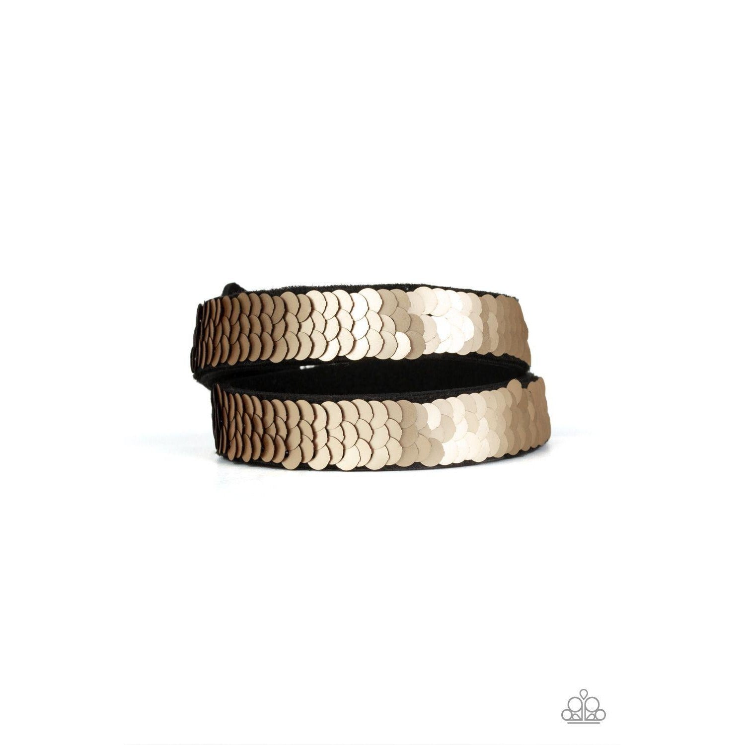 Row after row of shimmery sequins are stitched across the front of a lengthened black suede band. The elongated band allows for a trendy double wrap design. Bracelet features reversible sequins that change from brown to red. Features an adjustable snap closure.