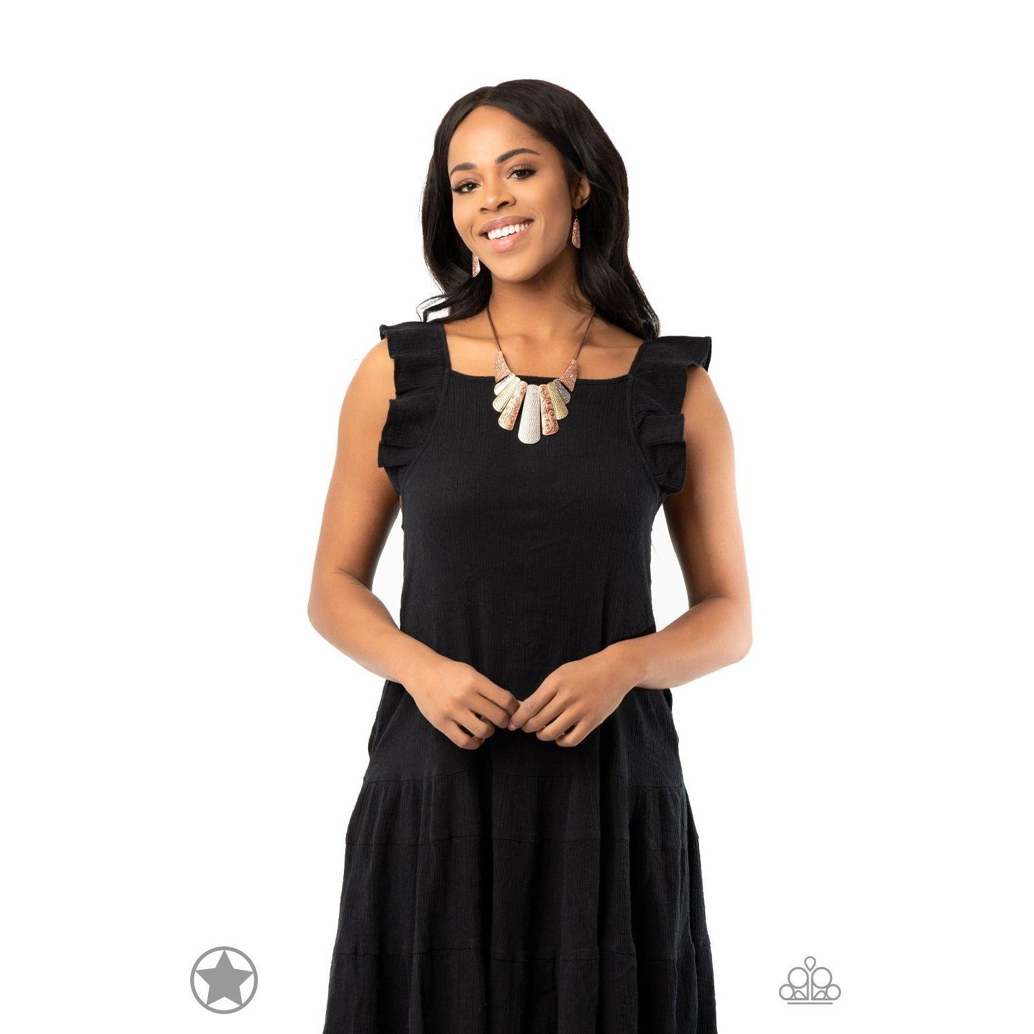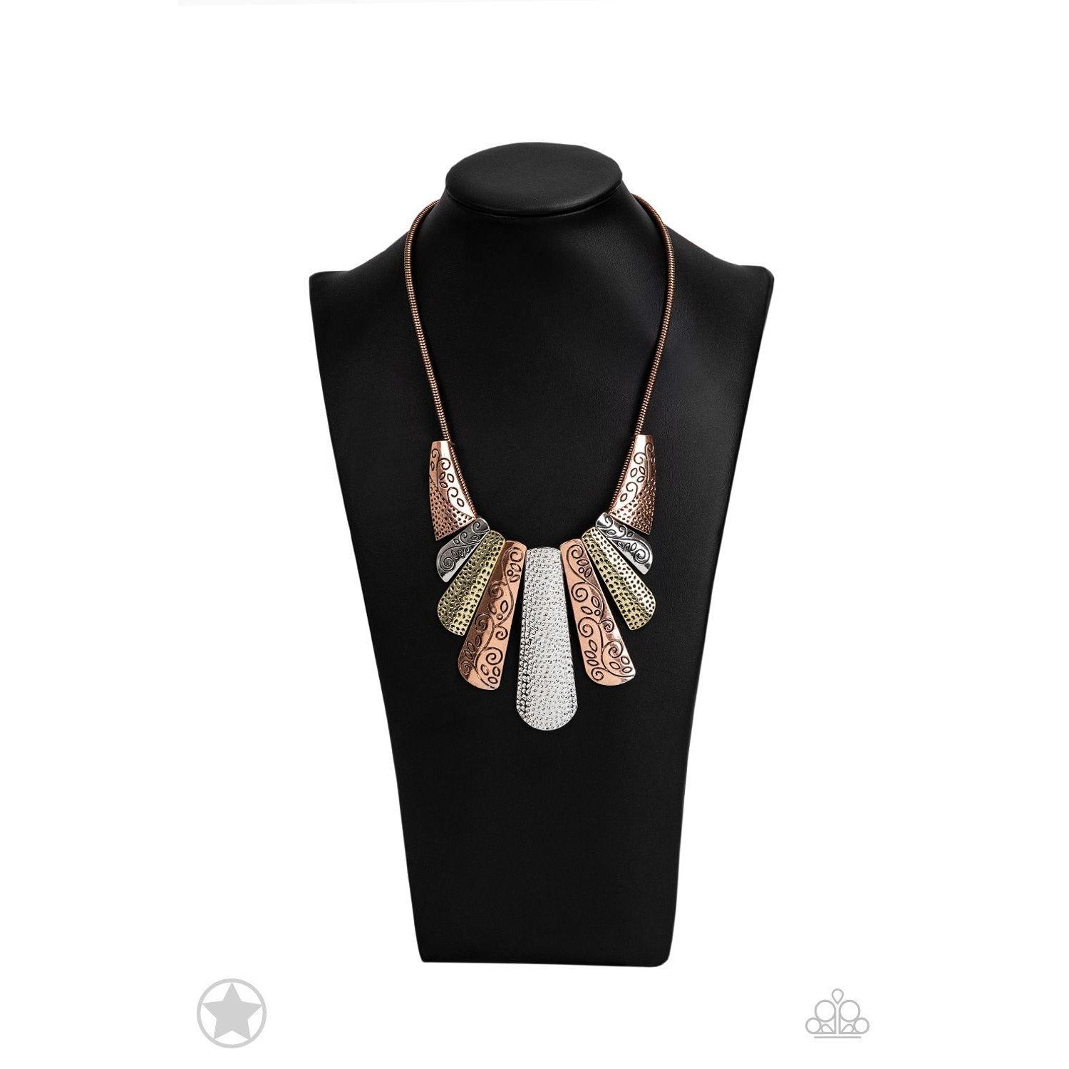 Copper, silver and brass plates featuring various hammered and filigreed textures fan out across the chest along a thick copper snake chain. The gorgeous tribal design falls gracefully below the collar into a dramatic statement piece. Features an adjustable clasp closure.