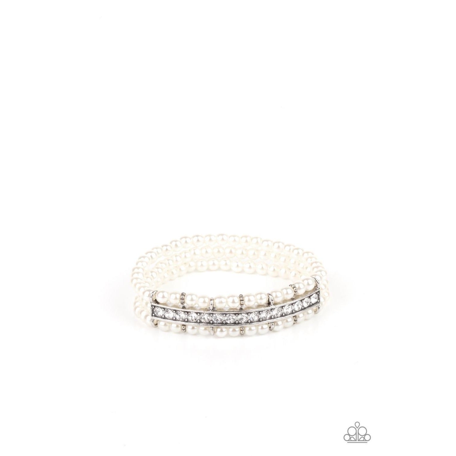 Threaded along stretchy bands, three rows of dainty white pearls are held in place around the wrist by a white rhinestone encrusted centerpiece for a romantic flair.
