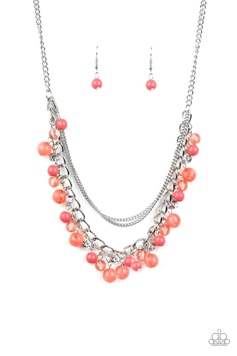 Infused with layers of mismatched silver chains, glassy, polished coral, and glittery white rhinestones swing from the bottom of a bold silver chain, creating a bubbly fringe below the collar. Features an adjustable clasp closure.