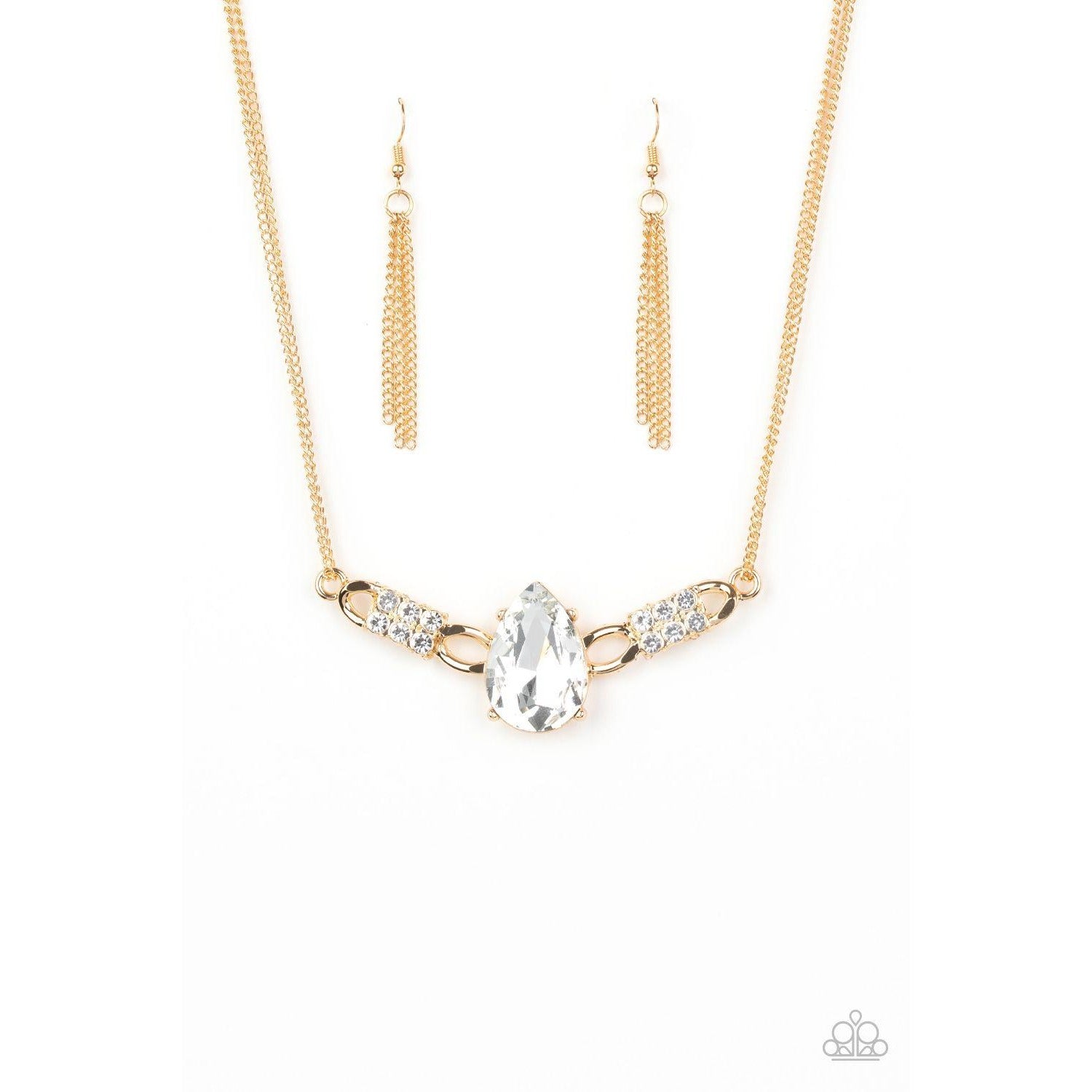 Cut into an alluring teardrop, an oversized white rhinestone gem attaches to bold gold frames radiating with glassy white rhinestones. The dramatic pendant attaches to doubled gold chains, swinging horizontally below the collar in a glamorous fashion. Features an adjustable clasp closure.