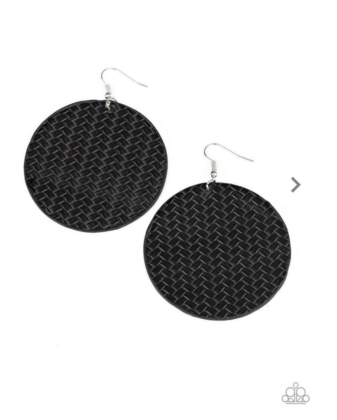 Shiny black cording weaves into a plaited frame for a colorfully rustic look. Earring attaches to a standard fishhook fitting.