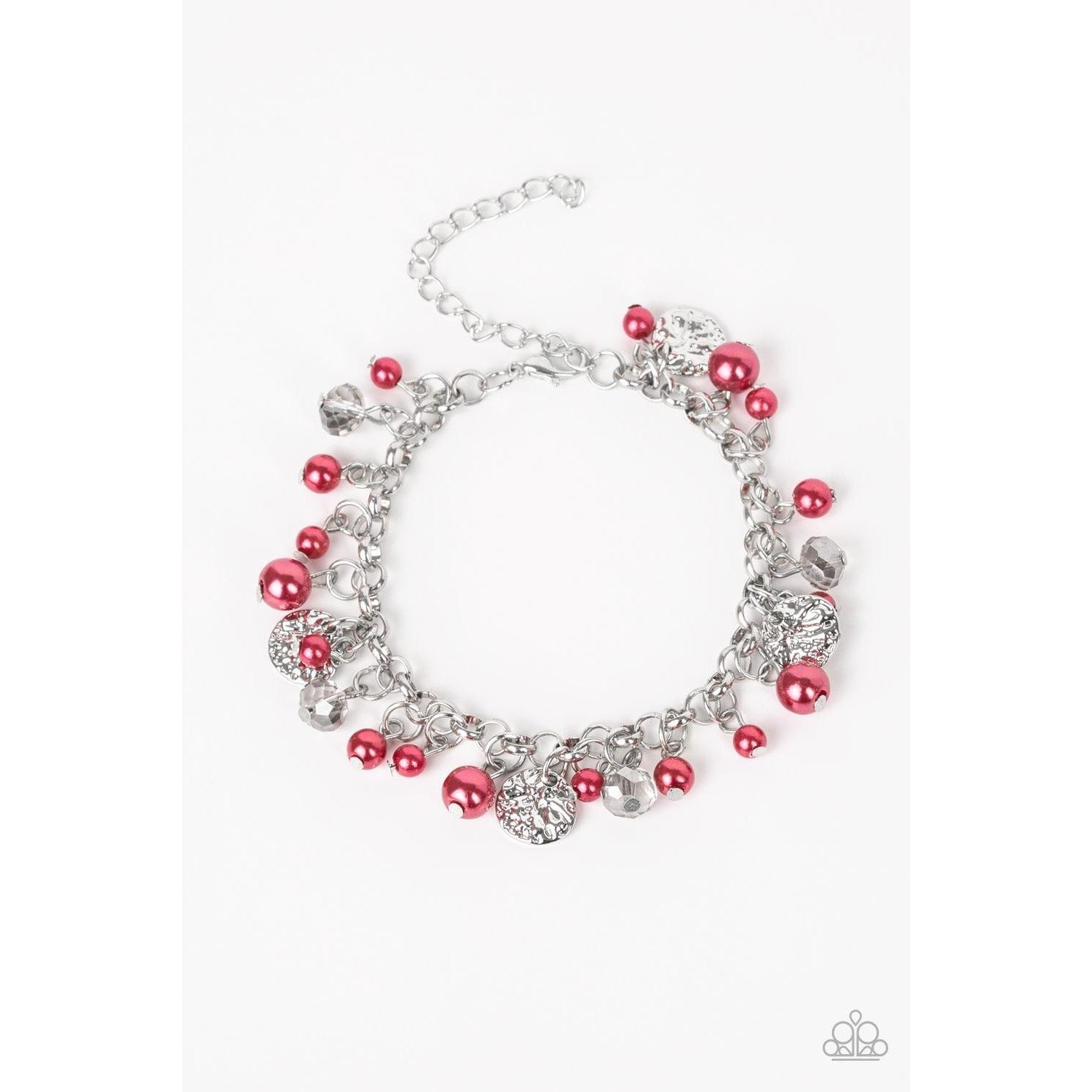 Pearly red beads, smoky crystal-like gems, and hammered silver discs swing from a bold silver chain, creating a refined fringe around the wrist. Features an adjustable clasp closure.