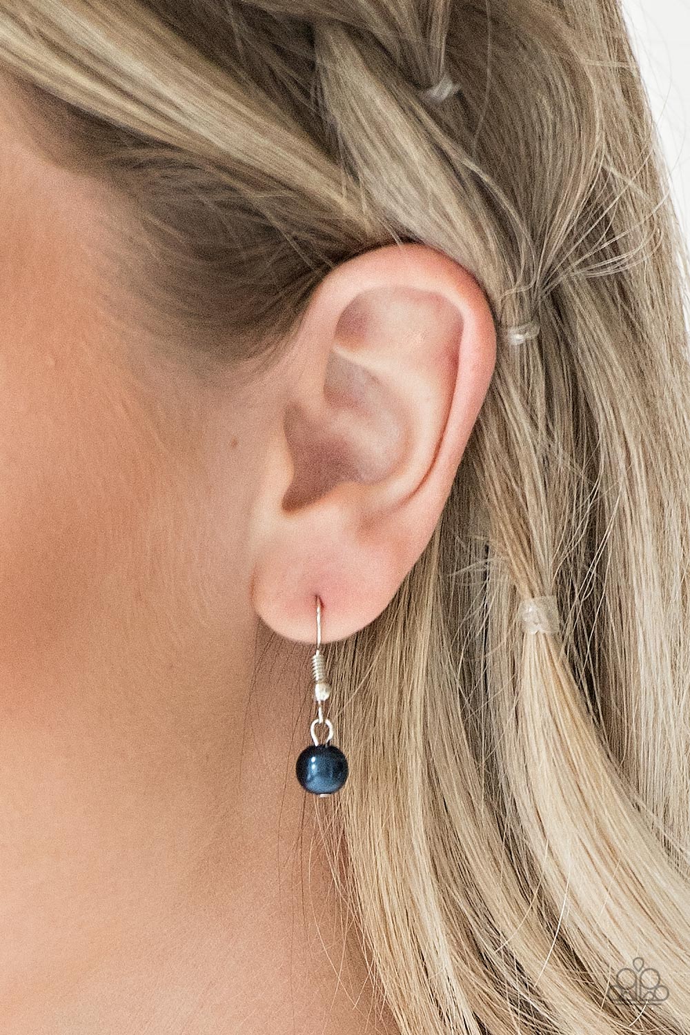 Glittery white rhinestones and classic blue pearls swing from the bottom of interlocking silver chains, creating a bubbly fringe below the collar. Features an adjustable clasp closure.