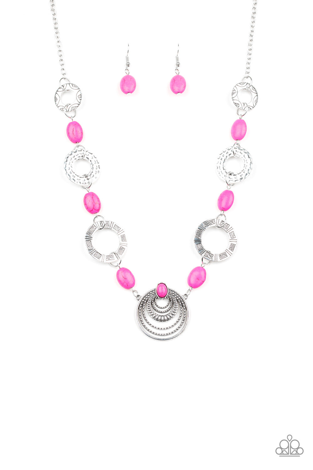 Hammered, stamped, and studded in tribal inspired patterns, a collection of ornate silver discs link with vivacious pink stones below the collar for a colorful flair. Features an adjustable clasp closure.