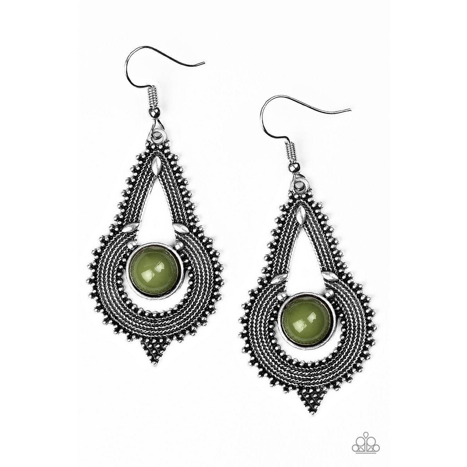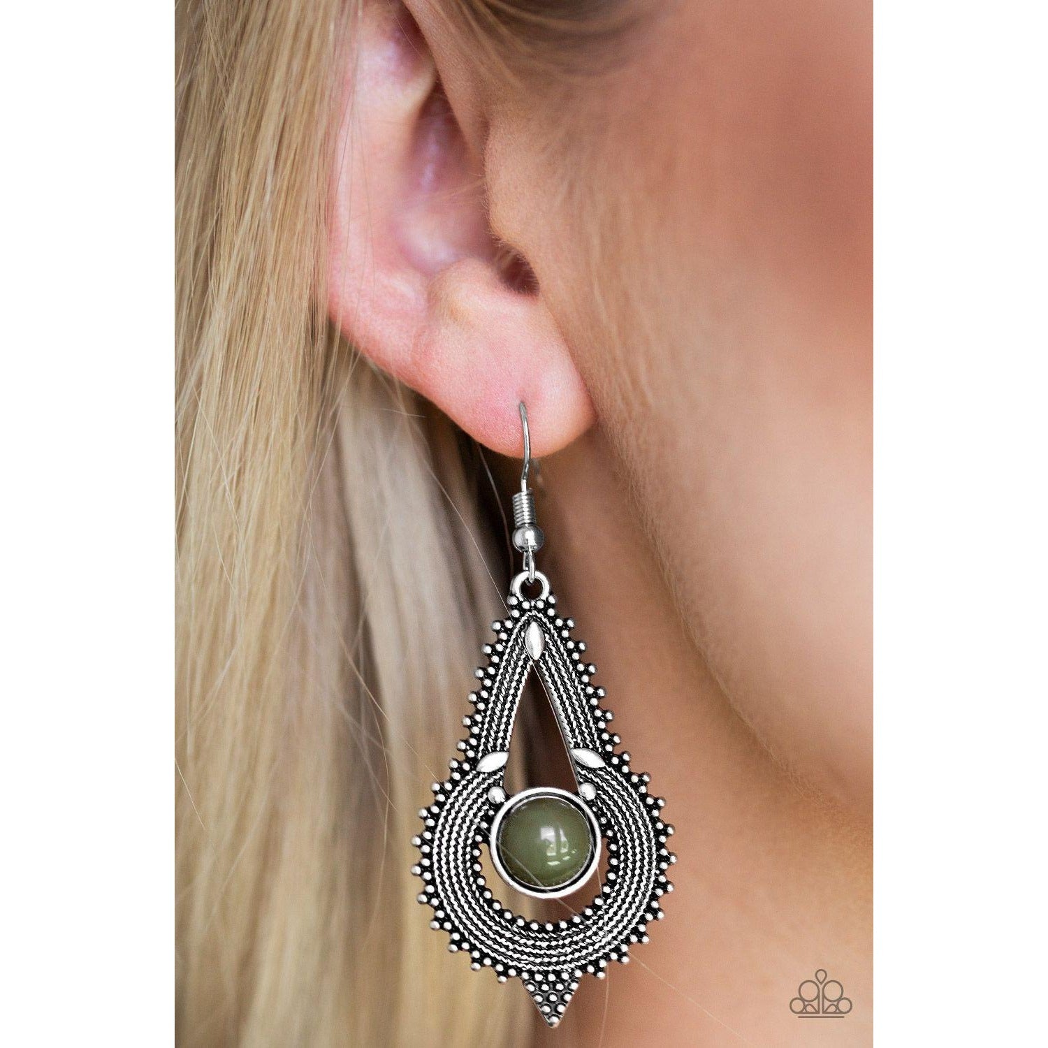Radiating with studded and rope-like textures, an ornate silver frame joins around a polished green beaded center for a seasonal look. Earring attaches to a standard fishhook fitting.
